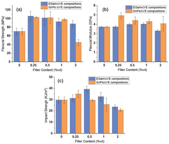 The flexural strength (a), flexural modulus (b), and impact strength (c) of the EGaIn- and GnP-modified cVE composites at different filler contents.