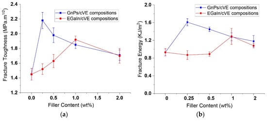 The ability of the cVE resin with and without EGaIn and GnPs fillers in the resistance of the propagation of a pre-existing crack was determined via a Mode I type of fracture failure. The fracture toughness (KIc) and fracture energy (GIc) versus the weight fraction of the fillers are demonstrated in Figure 8. It was observed that the fracture toughness and fracture energy of both EGaIn- and GnP-modified cVE composites were enhanced at all filler loading levels up to 2 wt.%. The GnPs/cVE composites showed a rapid increase in the fracture toughness and fracture energy by up to 50% and 73% at 0.25 wt.% filler content (Table S4, Supplementary Materials), respectively. These enhancements then decreased gradually with further addition GnPs content up to 2 wt.%. The same behaviour was observed for the EGaIn/cVE composites; however, the maximum improvement in the fracture toughness and fracture energy was achieved at 1 wt.% filler content with an increase of over 32% and approximately 39% (Table S4, Supplementary Materials), respectively. Moreover, it can also be seen that EGaIn was less effective than GnPs in promoting the fracture toughness and fracture energy at low filler loadings (under 1 wt.%). The enhancement in the fracture toughness and fracture energy of both EGaIn- and GnP-filled cVE composites may be explained by the fact that the presence of EGaIn or GnPs in the polymer matrix impedes crack propagation, resulting in more efficient energy dissipation and a delay in the onset of failure. The composites therefore sustain a greater amount of applied load. Meanwhile, the reduction in the promotion effects in the fracture toughness and fracture energy of both EGaIn- and GnP-filled cVE composites could be a result of the formation of aggregates of EGaIn droplets and the agglomeration of GnPs within the cVE matrix. Such aggregates and agglomerations act as defect points causing a decrease in the toughening effect owning to the restriction of the interaction between EGaIn and the cVE matrix GnPs or the interfacial adhesion between GnPs and the cVE matrix [56,60].