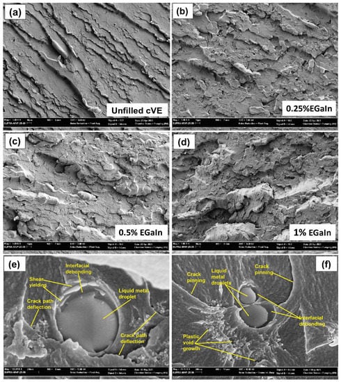 SEM images of the fracture surface of the unfilled cVE matrix (a) and the EGaIn/cVE composites, containing 0.25% (b), 0.5% (c), and 1% (d) filler, and the toughness mechanisms in the EGaIn/cVE composites (e,f).