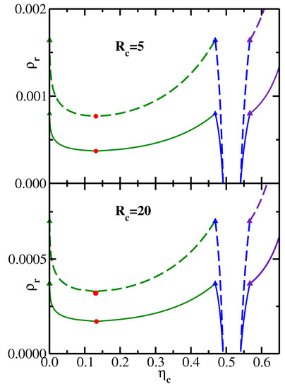 Figure 2. Phase boundaries for an effective one-component colloidal system in the reservoir representation in the variables η c ρ r . Green lines denote the liquid–vapor phase boundary, blue lines mark the liquid–solid phase boundary, and purple lines correspond to the vapor–solid phase boundary. Red circles mark the location of the liquid–vapor critical points, and the triangles denote the vapor–liquid–solid triple point coexistence. Upper panel: solid lines correspond to the polymeric chains with ( N = 40 , κ = 25.1); dashed lines correspond to the polymeric chains with ( N = 96 , κ = 3.5); the colloid radius is R c = 5 . Lower panel: solid lines correspond to the polymeric chains with ( N = 48 , κ = 11.5); dashed lines correspond to the polymeric chains with ( N = 96 , κ = 3.5); the colloid radius is R c = 20 .