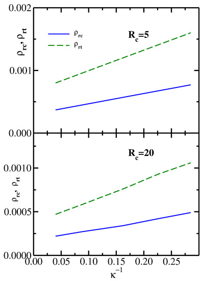 Figure 4. The monomer reservoir density corresponding to the liquid–vapor critical point ρ r c and to the vapor–liquid–solid triple point ρ r t as functions of the inverse stiffness parameter κ 1 . Upper panel: colloid radius R c = 5 ; Lower panel: colloid radius R c = 20 .