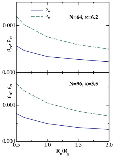 Figure 5. The monomer reservoir density corresponding to the liquid–vapor critical point ρ r c and to the vapor–liquid–solid triple point ρ r t as functions of the ratio R c / R g . Upper panel: semiflexible chain with ( N = 64 , κ = 6.2 ); Lower panel: semiflexible chain with ( N = 96 , κ = 3.5 ).