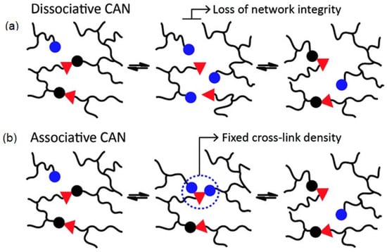 Dissociative (a) and associative (b) CANs based on exchange reactions and occurring, respectively, with or without a temporary loss of crosslink density. Reproduced from [43]. with permission from the Royal Society of Chemistry.
