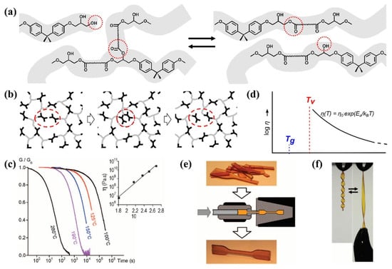 In a pioneering work [79], a crosslinked polymer was obtained by the reaction of DGEBA and a mixture of dicarboxylic and tricarboxylic acids with a 1:1 epoxy group/COOH stoichiometric ratio. The presence of hydroxyl and ester groups during catalysis with zinc acetylacetonate ensured the transesterification reaction. The synthesized material in the glassy state was identical in properties to the classical epoxy anhydride polymer: Tg ≅ 80 °C, Young’s modulus ~1.8 GPa, and the stress at the break was ~55 MPa. However, unlike the latter, at T ≫ Tg, the material exhibits fluidity due to the transesterification reaction and the rearrangement of the network topological structure caused by it (Figure 4).