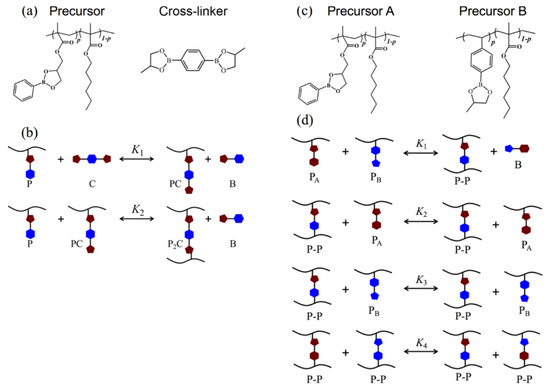 (a) Precursor and crosslinker structures and (b) two-stage reactions between them [110] and (c) structures of precursors A and B and (d) dominant reactions between them [109]. Reprinted with permission from [110]. Copyright (2021) American Chemical Society and [109]. Copyright (2020) American Chemical Society.