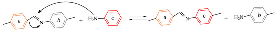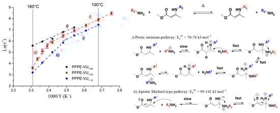 Associative CANs, known as vitrimers [79,80,81,82], in contrast to dissociative networks, are characterized by the possibility of exchange substitution reactions, which ensures that the degree of crosslinking is independent of temperature [82]. They are often considered [43,83,84] as special materials that combine the properties of a thermoplastic and a thermoset with a topological transition temperature (Tv): at T ≥ Tv > Tg, an exchange of bonds occurs, leading to a flow to the polymer, and the material passes from a viscoelastic solid (thermoset) into a viscoelastic fluid (thermoplastic). In vitrimers, bond exchange occurs within a single reaction [29,67,68,85]. The most common type of dynamic covalent exchange in esters and related compounds, such as carbamates, carbonates and carbamides, as well as acetals and imines, is “addition-elimination” [84].