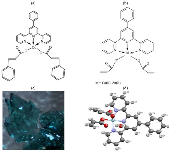 - Baimuratova, R.K.; Dzhardimalieva, G.I.; Zhinzhilo, V.A.; Kydralieva, K.A.; Uflyand, I.E. Metal-containing monomers based on copper and zinc salts of unsaturated acids and pendent 4-phenyl-2,2′:6′,2″-terpyridine ligands: Synthesis, characterization and thermal properties. Key Eng. Mater. 2020, 869, 119–128. [Google Scholar] [CrossRef]
