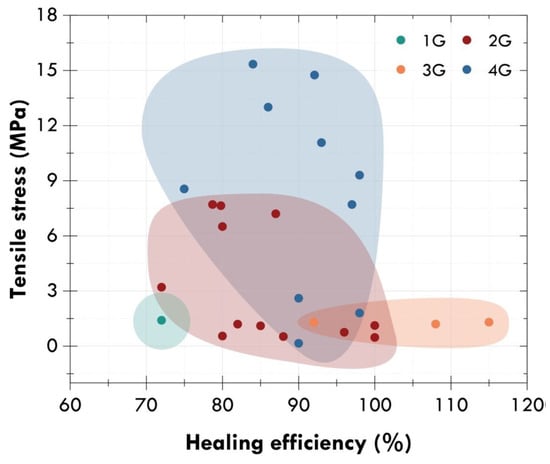 The second (extrinsic) method consists of the release of healing agents from containers (hollow glass fibers, capsules, microvessels), which break under the action of a crack propagating inside the material and lead to its healing [32,33]. Most of the healing action takes place at room temperature, but sometimes heating is required to improve healing efficiency. Efficiency is measured quantitatively as the ratio of any property of the healed material to the original, expressed as a percentage.
