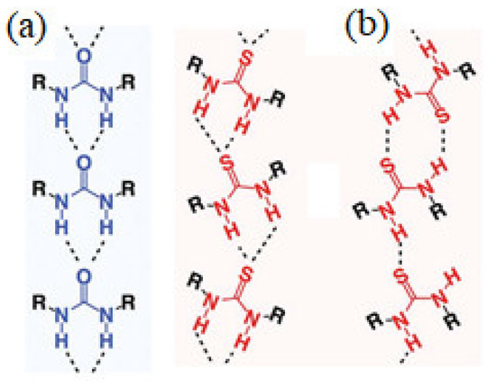Hydrogen bond structures: (a) linear ureas and (b) zigzag thioureas. Reprinted with permission from Ref. [73]. Copyright (2022) the American Association for the Advancement of Science (AAAS).
