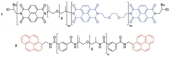 The supramolecular polymer mixture formed by the π–π interaction between a pyrenyl oligomer (1) with end blocks rich in π-electrons and an oligomer containing naphthalene-diimide units (2) poor in π-electrons was reinforced with cellulose nanocrystals to obtain a self-healing nanocomposite (Scheme 2) [55].