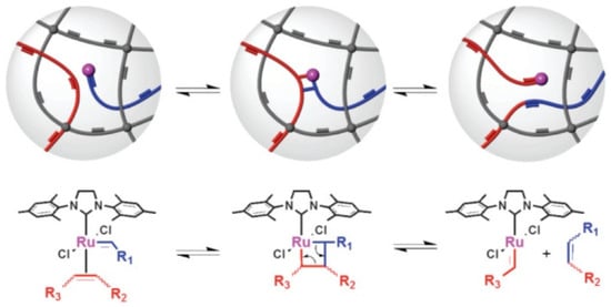 Polymers containing such dynamic bonds are known as covalent adaptable networks (CANs). Bond exchange reactions in network polymers proceed according to one of two mechanisms [42,43]: a dissociative process, in which crosslinks are split into their constituent reactive fragments with subsequent regeneration [44]; or an associative process, in which a pendant reactive group enters into substitution reactions with an existing crosslink. These mechanisms are realized as interchain exchange reactions [45], in particular, transesterification [46,47] and metathesis [48,49,50]. In any case, the topological structure in CAN is restructured, which is triggered by pressure and temperature and leads to the healing of damages (Figure 2).