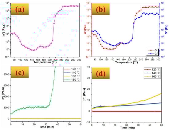 Rheological curves of BZPN/AC/TW foam precursor: (a) temperature scan of η*, (b) temperature scan of G′ and G″, (c) time scan of η*, and (d) magnified time scan of η*.