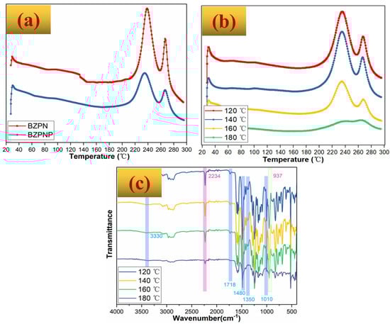 For thermosetting systems, the rheological elastic and viscous behavior, in excess, is dominated by its curing reaction process. If bubbling occurs first without successive curing, bubbles collapse. Herein, the curing behavior of the BZPN foam precursor was characterized by DSC in Figure 3a. Bi-functional BZPN shows two curing peaks at 239 °C and 267 °C, corresponding to the oxazine ring-opening and phthalonitrile ring-forming curing reactions [,], respectively. The temperatures of these curing peaks are lowered in BZPN/AC/TW foam precursor. These results indicated that the active hydrogen-containing blowing agent of AC and foam homogenizer of TW-80 could promote the curing process of bi-functional BZPN, in line with the findings of a previous study []. Nevertheless, the onset temperature of the oxazine ring-opening reaction is over 180 °C from the DSC curve, and it is higher than the viscosity-foaming window temperature from the above DRA findings. This does not mean that the oxazine ring-opening reaction (or viscosification of the polymer) was not in progress below 180 °C. The direct evidence was provided in Figure 3b, where the DSC curves of the samples heated at 120 °C, 140 °C, 160 °C, or 180 °C for 1 h were displayed.