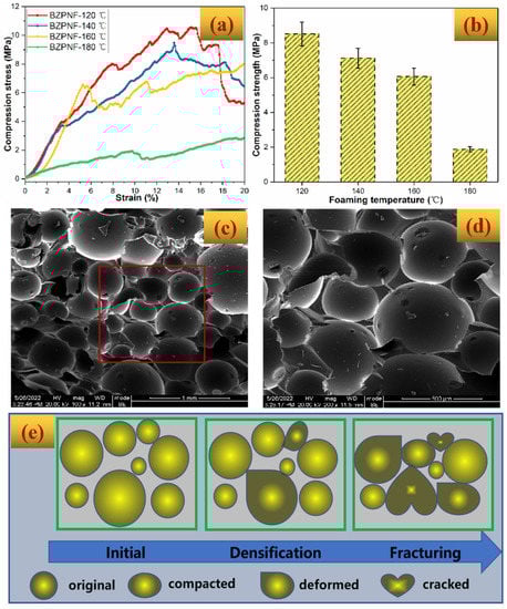 Figure 6c,d gives the SEM images of a BZPN foam formed at 140 °C after a compressive test. At the top and bottom in Figure 6c, a part of broken cells can be observed, leaving obvious fracture debris on the surface of the cells. In the middle of Figure 6c, some of the bubbles are deformed or compacted, suggesting that the bubbles are aggregated under the compression load. Moreover, the outline of bubbles in Figure 6c,d tends to be unclear in comparison with the original image in Figure 5b. These results indicate that there is a densification process in the BZPN foams during the compression test. Jalalian et al. also observed a densification phenomenon in the phenolic-based foams on the macro level during the compression test []. Based on these findings, the failure mechanism can be illustrated in Figure 6e. When the compression load was put on the BZPN foam, the stress accumulated quickly in the bottom or top layers of the BZPN foam. Due to the isolated pore structure and intrinsic brittleness of thermosetting resin, on the bottom or top plane, the bubble position is the mechanically weak location. Herein, the stress cannot be well transferred over the whole specimen through bubble buckling. The local concentrated stress immediately exceeded the limit of bubbles at the surface plane, making the bubble at this layer first. Consequently, the cracked bubbles were further compacted and they could enable stress transfer to the next layer resulting in the progressive fracture of the species until the failure of the main foam body. Herein, the fluctuation of the stress–strain curve in Figure 6a can be attributed to local cracks in mechanically weak regions []. On the other hand, such fracture behavior means that BZPN foams did not lose integrity after local failure.