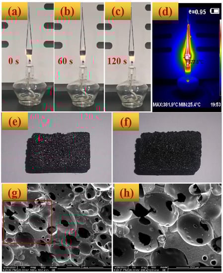 The images of BZPN foam before/after flame tests are first provided in Figure 7a–d. Even though the flame temperature is over 380 °C, the BZPN foam showed no softening and droplet phenomenon. Moreover, no visible smoke was emitted during the burning test. After the burning test, the glossiness of BZPN foam is reduced, but its macroscopic appearance is well-maintained (Figure 7e,f), indicating its superior flame retardant property.