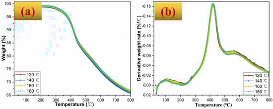 Figure 8a,b gives TGA/DTG results of BZPN foams. The temperatures at weight loss 5% (T5%), 10% (T10%), maximum decomposition temperature (Tmax), and char residue (Cr) at 800 °C, were also summarized in Table 3. In general, with the increasing foaming temperature, BZPN foams showed similar stabilities. This is because the thermal stabilities of the polymer are mainly determined by the polymer host. The decomposition of BZPN foams mainly contains three stages. The first slight weight loss before 200 °C was due to the moisture adsorbed by the porous structure of BZPN foam. Specifically, the existence of TW-80 surfactant in BZPN foam is an amphiphilic compound []. The second obvious weight loss is attributed to the degradation of the BZPN macromolecule with a Tmax of about 420 °C. The third one is the further carbonation of BZPN foam. However, all BZPN foams exhibited a T5%, T10%, Cr, and Tmax over 370 °C, 510 °C, 65%, and 420 °C, respectively. It should be mentioned that, in comparison with the previous polymer foams based on polyethylene [], polystyrene [], polyimide [], epoxy [], and phenolic foams [], BZPN foams exhibited more outstanding thermal stabilities.