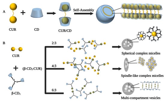 Preparation process of cyclodextrin self-assembled supramolecular networks. (A) Schematic diagram of the proposed mechanism of vesicle formation from CD and CUR [62]. (B) Schematic diagram of supramolecular self-assembly of three different shapes of curcumin/β-cyclodextrin trimers [63].