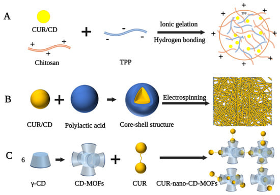 Fabrication process of different types of curcumin-loaded CD-based nanocarriers. (A) Chitosan-based nanoparticles [85]. (B) Nanofiber [88]. (C) Cyclodextrin-based metal–organic framework nanoparticles [89].