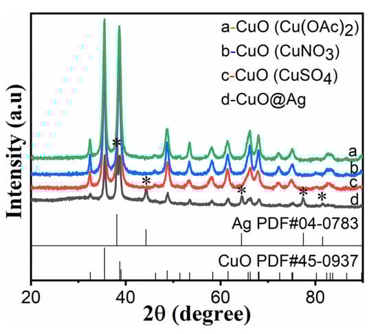 3.1. XRD Patterns of CuO and CuO@Ag Nanosheet Composites