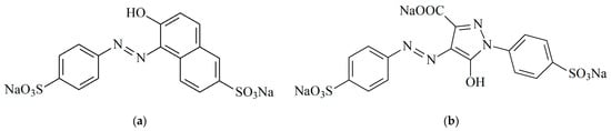 Azo dyes are the most commonly used class of colorants in the food industry. The synthetic dyes sunset yellow FCF and tartrazine (Figure 1) are typical additives in beverages, jelly, and other foodstuffs []. Both dyes can promote various negative health effects (allergic reactions, hyperactivity in children, mutagenic and cancerogenic effects) that are dose-dependent [,,,]. Therefore, the average daily intake of sunset yellow FCF and tartrazine are set as 4 and 7.5 mg/kgbw, respectively [,], and their contents in foodstuffs and beverages must be controlled.