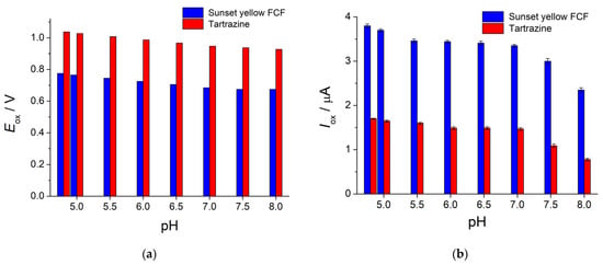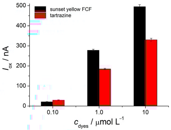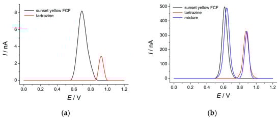 The oxidation currents of both dyes are also decreased with the increase in pH (Figure 9b). The difference in the oxidation currents at a pH of 5.5–7.0 is statistically insignificant for each dye. A sharp decrease in the oxidation currents has been observed in the basic medium, which is caused by the chemical oxidation of the dyes by air oxygen. The highest signals of both dyes were obtained at pH 4.8, which has been used in further investigations. Under these conditions, sunset yellow FCF and tartrazine exist as di- and tri-anions, respectively [].