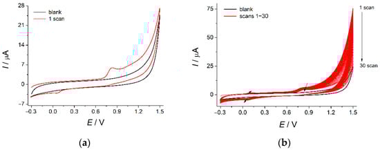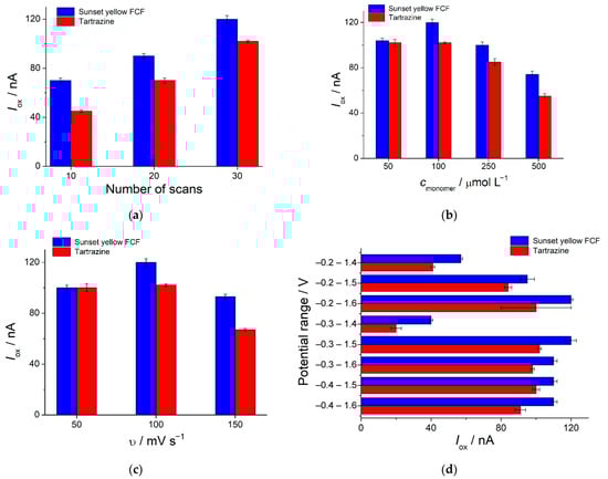 Of the increase in the number of scans leads to the significant growth of both dyes’ oxidation currents (Figure 5a). Nevertheless, the use of more than 30 scans is impractical as it increases the time required for the electrode preparation and leads to significant increase in the capacitive currents, which affects the response of the azo dyes. Therefore, 30 scans were used for poly(4-ABA) formation.