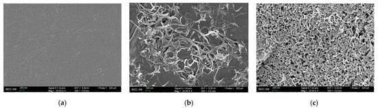Electrode surface morphology by scanning electron microscopy: (a) bare GCE; (b) MWCNTs/GCE; (c) Poly(4-ABA)/MWCNTs/GCE.