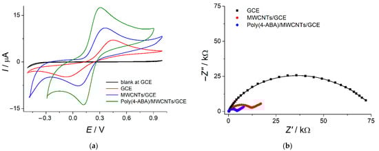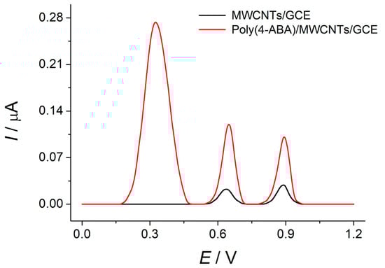Electrode surface modification provided a reversible oxidation of the redox marker (Figure 7a), which confirms an increase in the electron transfer rate. The effective surface area of the MWCNTs/GCE and poly(4-ABA)/MWCNTs/GCE, of 75 ± 3 and 93.7 ± 0.9 mm2, was calculated using the Randles–Ševčík equation. A 10.5- and 1.25-fold increase in the effective surface area of the polymer-modified electrode vs. bare GCE and MWCNTs/GCE agree with the scanning electron microscopy data and explain the increase in the sunset yellow FCF and tartrazine oxidation currents.