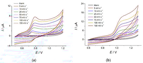 A potential scan rate effect in the range of 5–150 mV s−1 on the dyes’ voltammetric characteristics has been studied (Figure 10).
