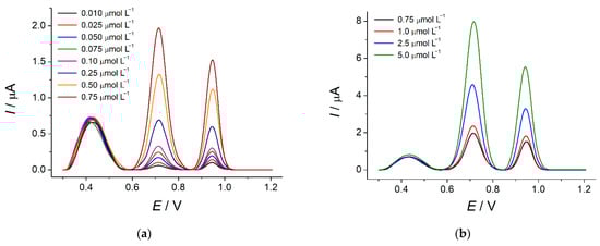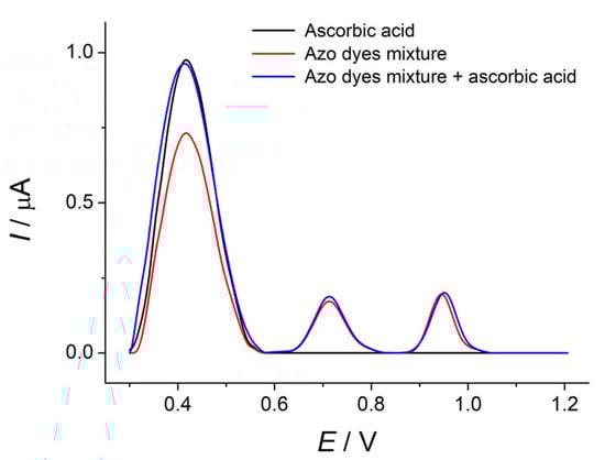 The peak potential separation of 262 mV is achieved, which makes the simultaneous detection of azo dyes (Figure 2b) possible. A slight anodic shift of the oxidation potentials for the dyes in the mixture does not affect the resolution of the signals. Nevertheless, the shape of the voltammograms suggests a partial overlapping of the signals for the higher concentration of dyes in mixture.
