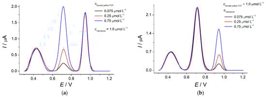 Baseline-corrected differential pulse voltammograms of sunset yellow FCF and tartrazine non-equimolar mixtures at the poly(4-ABA)/MWCNTs/GCE in phosphate buffer pH 4.8: (a) fixed 1.0 µmol L−1 concentration of tartrazine and varied concentration of sunset yellow FCF; (b) fixed 1.0 µmol L−1 concentration of sunset yellow FCF and varied concentration of tartrazine. Modulation amplitude is 100 mV, modulation time is 25 ms, potential scan rate is 20 mV s−1.