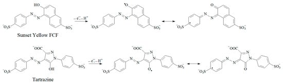 where R is the universal gas constant (8.314 J mol−1 K−1), T is the temperature (298 K), αa is the anodic transfer coefficient, n is the number of electrons, F is the Faraday constant (96485 C mol−1), υ is the potential scan rate (V s−1). Based on the slopes of the E = f(lnυ) plots and the anodic transfer coefficients values, the number of electrons participating in the electrode reactions are 0.93 for sunset yellow FCF and 1.2 for tartrazine, i.e., one-electron electrooxidation takes place for both dyes. Similar data have been reported in [,,,,]. The hydroxyl group in the azo dyes’ structure undergo one electron and one proton transfer, according to Scheme 2. The radicals formed can undergo further reactions.