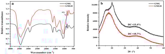 From the FT-IR spectra shown in Figure 2a, it can be seen that GMGH has no new characteristic peaks compared with GMG. The broad peak at 3500–3400 cm−1 corresponds to the stretching vibration of the O-H group in GMG. The asymmetric stretching vibration absorption peak of CH2 appeared at 2920 cm−1, which was the characteristic absorption peak of GMG. The peak at 1630 cm−1 was formed by two O-H shears in the water molecules absorbed by GMG, while the peaks at 1150 and 1078 cm−1 were attributed to the C-O stretching vibration absorption peaks. The characteristic peak at 870 cm−1 was the stretching vibration peak of the GMG skeleton wherein the absorption intensity of GMG was weakened, indicating that the arrangement of the GMG network structure changed from a disorderly interwoven state to an orderly 3D network structure. The SEM images (Figure 1) also directly reflect this phenomenon.