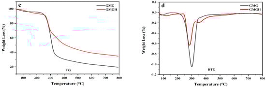 (a) FT-IR spectra of the GMG and GMGH powders; (b) X-ray diffraction patterns of GMG and GMGH; (c,d) thermogravimetric analysis of the GMG and GMGH powders.