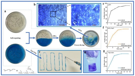 (a,d) Photos showing the self-healing behavior of GMGH; (b) image of the network pore structure of freeze-dried self-repaired GMGH; (c) GMGH can be injected using needles; (e) swelling index in water at pH 9; (f) Swelling index in 0.9% NaCl solution; (g) Swelling index in tap water.