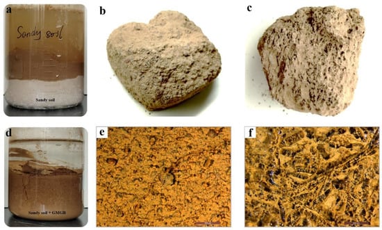 (a) The sandy soil absorbs water slowly; (b) dried sandy soil; (c) dried sandy soil–GMGH; (d) the sandy soil with GMGB absorbs water quickly; (e) enlarged SZM image of the sandy soil; (f) enlarged SZM image of the sandy soil–GMGH.