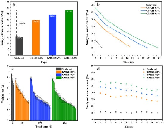 Figure 5c shows the weight change of the sandy soil in each period (day or night) until the expansion index was reduced to 10% in the artificial climate chamber. The water loss of the sandy soil, GMGH-0.1%, GMGH-0.3%, and GMGH-0.5% in each period showed a downward trend, from 4.28 to 3.3 g, 3.73 to 1.71 g, 3.91 to 1.24 g, and 4.02 to 1.08 g, respectively. GMGH can overcome the poor water storage capacity limitations of sandy soil and provide sustainable water for plant growth.