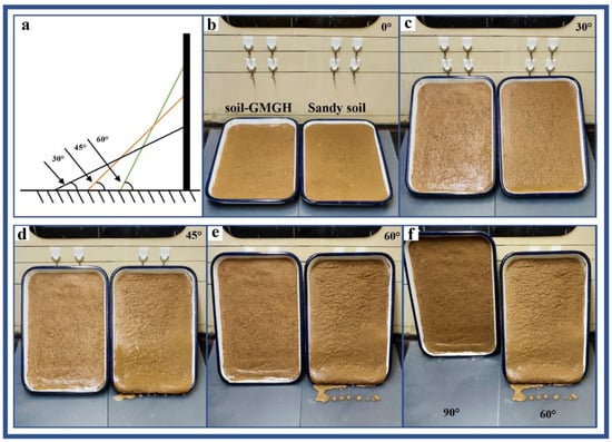 Sandy slope simulation diagram. (a) Cross-section angle; (b) wet soil–GMGH and sandy soil at 0°; (c) wet soil–GMGH and sandy soil at 30°; (d) wet soil–GMGH and sandy soil at 45°; (e) wet soil–GMGH and sandy soil: 60°; (f) wet soil–GMGH and sandy soil at 90° and 60°.