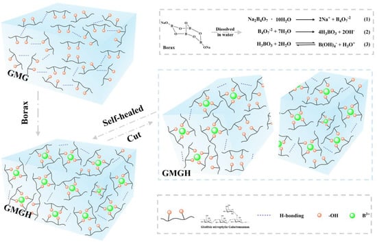 Furthermore, research on the water-retaining agents created from natural polysaccharides is relatively limited. Natural polysaccharide materials are non-toxic, harmless, biocompatible, and biodegradable, and have a significant effect on ecological restoration [,,,]. In this study, Gleditsia microphylla gum (GMG), extracted from Gleditsia microphylla (GM) seeds, was selected as the raw material. GMG is mainly composed of galactomannan, which consists of linear (1→4)-linked β-D-mannopyranosyl and side chains of (1→6)-linked α-D-galactopyranosyl units with hydroxyl groups []. Borax cross-linked Gleditsia microphylla galactomannan hydrogel (GMGH) was obtained via a simple, easily accessible, environmentally friendly, and efficient method and its potential application as a water-retaining agent in sandy soil was analyzed.