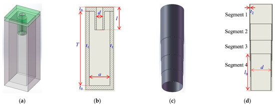 Furthermore, each metamaterial cell contained 9 single Helmholtz resonators, and the schematic drawing and cutaway view of a single Helmholtz resonator are shown in Figure 2a and Figure 2b, respectively. Moreover, the influencing parameters of the single Helmholtz resonator on its sound absorption performance are marked in Figure 2b, which consists of the diameter of the aperture d, length of the aperture l, thickness of the front and back panel t0, thickness of the side wall t1, length of the cavity T and side length of the cavity a (section of the chamber was square). These parameters were identical for each Helmholtz resonator except l. The tunable aperture was realized by 4 segments of the extendable cylindrical chambers, and its schematic drawing and cutaway view are shown in Figure 2c and Figure 2d, respectively. The 4 segments of the cylindrical chambers had same thickness t2 and length l0, and each diameter was approximate to the diameter of the aperture d because d >> t2, as shown in Figure 2d. In actual applications, the distance between the neighboring metamaterial cells was their side length 3a + 3t, and that between the adjacent single Helmholtz resonators was their side length a + t.
