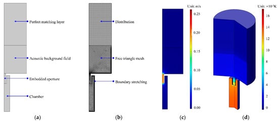 In order to study the sound absorption mechanism of the TA–MPCHR, the three-dimensional acoustic finite element simulation model was built, as shown in Figure 6a. It is further gridded in Figure 6b, which is similar with the two-dimensional rotational symmetric model in Figure 3b. Additionally, the theoretical sound absorption coefficients were obtained as shown in Figure 5a–d. It can be seen that the theoretical values were consistent with the actual experimental data, and deviations were generated by idealized conditions in the simulation process. The arrangement of 5 metamaterial cells and that of 9 Helmholtz resonators in each metamaterial cell are exhibited in Figure 6c and are consistent those shown in Figure 1a,d. The parameters for the gridded mesh consisted of a maximum cell size of 3.7 mm, a minimum cell size of 0.037 mm, a maximum unit growth rate of 1.3, a curvature factor of 0.2, and the resolution of the narrow region which was 0.95. In order to increase the simulation accuracy, the boundary layers were refined with the stretching factor 1.2 and the regulatory factor of their thicknesses 1. Meanwhile, the plane wave with the amplitude 1 was utilized in the background acoustic field as the incident sound wave with normal incidence, and the perfect matching layer was used to simulate the perfect absorption of the sound waves in the process of propagation away from the sound source. The diameter of the front panel D was equal to the diameter of the perfect matching layer and that of the acoustic background field, and it was selected as 100 mm in this study, which was consistent with the actual diameter of the proposed acoustic metamaterial of the TA–MPCHR sample. The direct linear solver of PARDISO was selected as a steady-state solver in the finite element simulation procedure which could utilize shared-memory parallel processing to improve the computational efficiency.