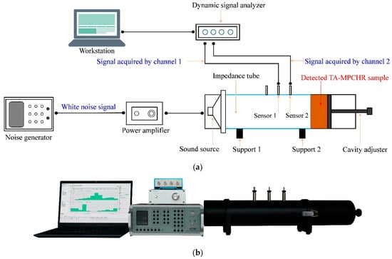 Therefore, the desired sound absorber based on the proposed acoustic metamaterial of the TA–MPCHR could be obtained by adjusting the length of the aperture l one by one according to the target frequency range. For example, a certain equipment had 4 operating modes, and the corresponding generated noises were in the range of 500–800 Hz, 550–900 Hz, 600–1000 Hz and 700–1150 Hz, respectively. For common MPCHRs, there are normally two popular methods for the effective control of the noise generated by this equipment. First was the development of the sound absorber with the broad absorption band of 500–1150 Hz, which indicated a large thickness of the absorber to use more space, and it was difficult to design such an absorber with broadband [27]. Second was the fabrication of 4 sound absorbers with different absorption bandwidths corresponding to the 4 noise spectrums and the change of various absorbers for each kind of operating modes, which meant there were high manufacturing costs and heavy replacement workload [28]. Fortunately, the TA–MPCHR can effectively solve this kind of problem. The chambers of the metamaterial cell for this sound absorber can be fixed directly, and the required quantity of metamaterial cells depend on the area of the workshop. Meanwhile, the optimal length of the apertures can be calculated in advance for the 4 operating modes, which can be tuned simply by adjusting the 4 segments of the cylindrical chambers, and the well-tuned front panel is installed to the back chamber of metamaterial cell. Using this method, various sound absorption properties were gained by the proposed acoustic metamaterial of the TA–MPCHR and the adjustment was easy to realize. The sound absorption coefficients of the TA–MPCHR sample were detected through an AWA6290T detector, referring to the national standard of GB/T 18696.2–2002 (ISO 10534–2:1998) based on the transfer function method [29,30,31]. The schematic diagram of the detection process is exhibited in Figure 4.