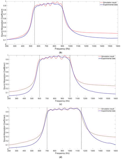 Detection of the TA–MPCHR sample. (a) Absorption property for 500–800 Hz. (b) Absorption property for 550–900 Hz. (c) Absorption property for 600–1000 Hz. (d) Absorption property for 700–1150 Hz.