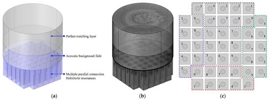 The finite element simulation of TA–MPCHR sample. (a) Three-dimensional acoustic finite element simulation model. (b) The gridding model. (c) The arrangement of metamaterial cells and Helmholtz resonators.