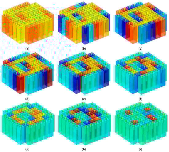 For the operating mode of the equipment with a frequency range of 600–1000 Hz, the distributions of temperature for the frequency point with an interval of 50 Hz are shown in Figure 7a–i. It can be observed that the sound absorption at the resonance frequency was mainly determined by the corresponding Helmholtz resonator and the sound absorption at the other frequency point was achieved using the coupling effect of all Helmholtz resonators, which was consistent with the normal principle for common MPCHRs [32]. By contrast, for the sound absorbers of common non-adjustable MPCHRs with various total thicknesses of 40–80 mm by intervals of 10 mm, they were optimized in a finite element simulation model to achieve a broad absorption band of 500–1150 Hz with a maximal average sound absorption coefficient. With the exception of the cavity T and that of the apertures li, the parameters were the same as those of the TA–MPCHR in Table 1.