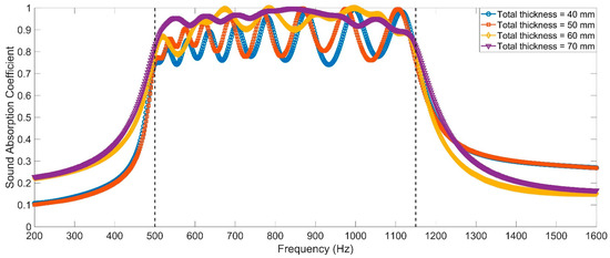 The optimal parameters for common non-adjustable MPCHRs with various total thicknesses are summarized in Table 3, and the corresponding distributions of the theoretical sound absorption coefficients are shown in Figure 8. It should be noted that the length of the aperture li might be smaller than the thickness of the front panel t0 to realize the effective sound absorption in a high frequency region, which indicated that the front panel should be thinned for the corresponding Helmholtz resonators. It could be found that, in order to gain an average sound absorption coefficient of 0.9202, which was the minimum value among 4 average sound absorption coefficients Table 2, the total thickness of common non-adjustable MPCHRs should be close to 80 mm, which was almost twice the total thickness of the TA–MPCHR (40 mm). These results further proved that the proposed acoustic metamaterial of the TA–MPCHR could significantly reduce the occupied space and improve sound absorption efficiency.