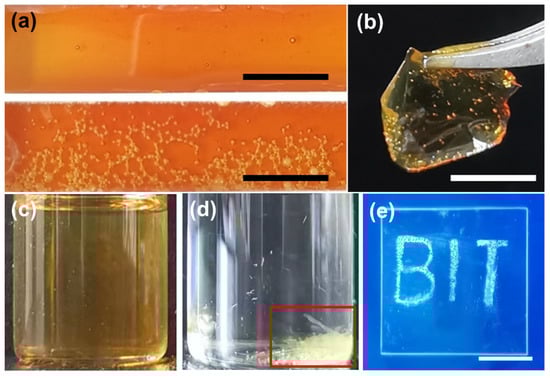 Photographic images of (a) GAP samples before (upper) and after (lower) UV-irradiation (254 nm, 20 min); (b) a free-standing crosslinked GAP film; (c) pristine GAP and (d) crosslinked GAP film in THF; (e) A pattern of “BIT” letters produced by irradiating the GAP film with a photo-mask. The fragmented GAP film pieces highlighted in red square in (d). Scale bars are 1 cm.