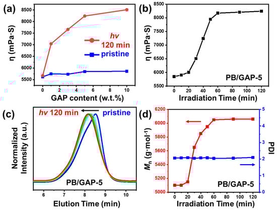 (a) Variation of the viscosity of PB/GAP blends before (blue) and after (red) 2 h of UV-irradiation; (b) Variation of the viscosity of PB/GAP-5 blend with UV-irradiation time; (c) GPC traces of the PB/GAP-5 blend after UV irradiation for different periods of time; (d) Mn and PDI of the PB/GAP-5 blend after UV irradiation for different periods of time.