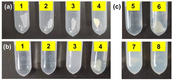 Photographic images of: (1) pure PEG2k, (2) PEG2k after irradiation, (3) pristine PEG2k/GAP-5 blend, and (4) the PEG2k/GAP-5 blend after photo-crosslinking (254 nm, 2 h): (a) before immersion in water, and (b) immersed in water for 10 min; (c) Photographic images of blend samples after photo-crosslinking (254 nm, 2 h): PEG2K/GAP-1 (5), PEG2K/GAP-5 (6), PEG4K/GAP-5 (7) and PEG20K/GAP-5 (8) immersed in water for 24 h.