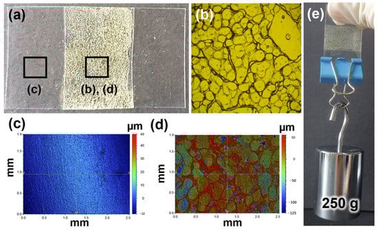 Moreover, another typical application of crosslinkers could be adhesives between polymer substrates [48,49]. In particular, this nitrene-radical-based crosslinker will be applicable to polymers without functional groups. For example, adhesion of low-surface-energy plastics such as polypropylene (PP) is an important problem in manufacturing. For a proof of concept, a very thin layer of GAP was applied between two PP plates for photo-crosslinking. Ideally, a monolayer of GAP should be applied between the two plates to allow the GAP chains to contact both surfaces. Due to the intrinsic surface roughness of these PP plates, an excessive amount of GAP was applied initially between the two plates, which was subsequently squeezed out by force to keep only the necessary amount of GAP. Consequently, the two pieces were adhered together after 254 nm UV irradiation for 2 h, and many gas bubbles were generated after irradiation (Figure 6a,b). A comparison of the optical profile topographic images of the crosslinked and the non-crosslinked regions showed a very strong contrast: the non-crosslinked region appeared to be very smooth (Figure 6c), but the crosslinked region appeared to be quite rough (Figure 6d). Despite these bubbles and much reduced contact area between the two plates, the adhesion was still strong and the adhered pieces were able to lift a weight of 250 g, which was over 30,000 times of the weight of GAP used, as shown in Figure 6e.